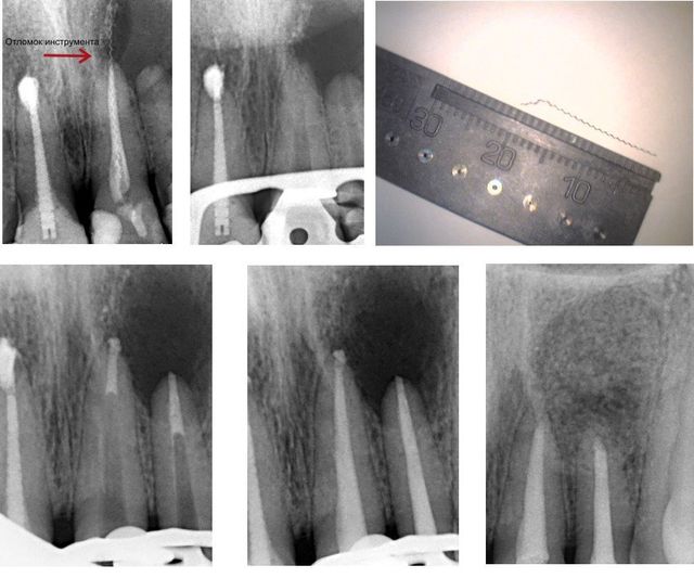 Пациент испытывал боль в области передних верхних зубов и до того, как обратиться к нам, посетил несколько клиник, где ему констатировали большую кисту в области двух передних верхних зубов и рекомендовали эти два зуба удалить вместе с кистой. Мы диагностировали наличие отломка инструмента в канале зуба, уходящего за верхушку корня и большую кисту в области двух верхних передних зубов. С помощью микроскопа был извлечен отломок инструмента, как видно на снимках, отломок был 2 сантиметра в длинну и уходил в полость кисты. Верхушки каналов были закрыты MTA-ProRoot. В этот же день была проведена хирургическая манипуляция (в связи с огромным размером кисты: 13 х 15 мм) с удалением кисты и заполнением полости специальным биосвоместимым материалом — OsteoBiol. В результате пациенту были сохранены зубы, приведены в порядок каналы и полностью вылечена область, где была киста.